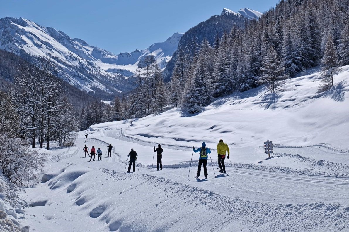 Itinéraire de ski de fond rouge qui parcourt la vallée de Ceillac depuis la Viste jusqu'au pied du Mélézet