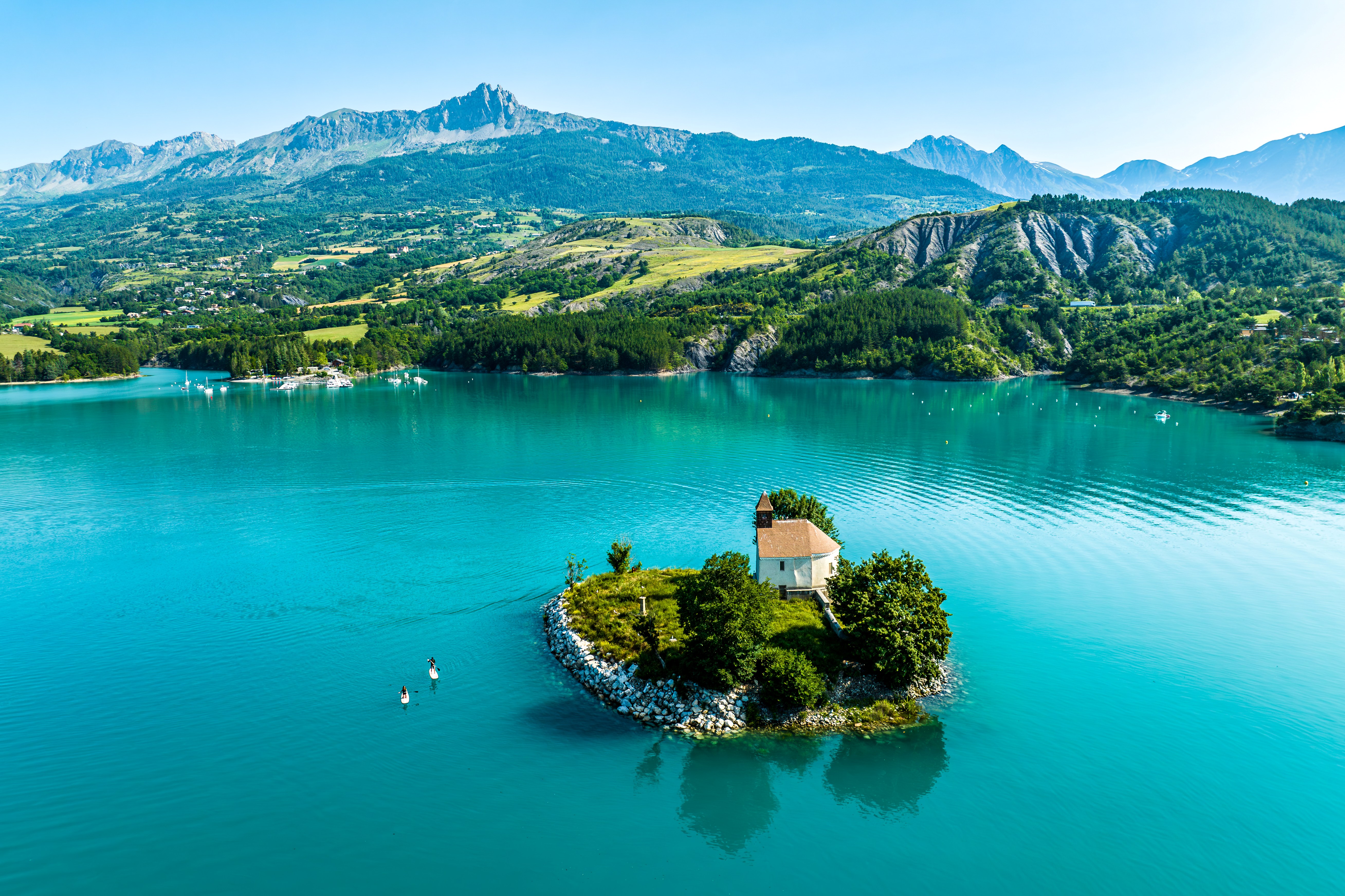 Posée au milieu du lac, elle est un peu l’emblème de Serre-Ponçon.