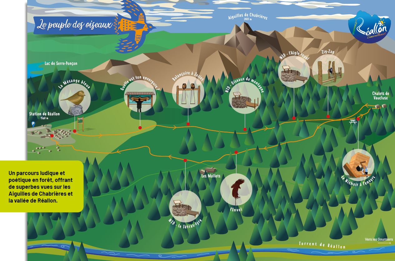 L'itinéraire est rythmé par différentes structures artistiques et récréatives qui nous instruisent sur la vie des oiseaux. Les pentes relativement douces permettent aux petits d'évoluer en sécurité. Si la balade se révèle trop longue, faites demi-tour au nichoir à l'envers et continuez par l'itinéraire indiqué.